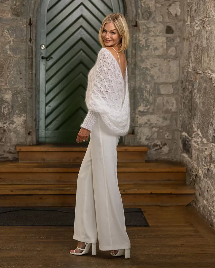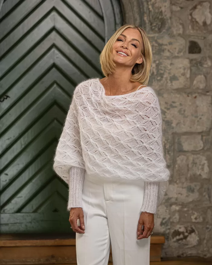 Tähän timanttikuvioisella pitsineuleella koristeltuun höyhenenkeveään kietaisuneulehuiviin on ilo kääriytyä erityisesti juhlatilaisuuksia varten. Huivin molemmissa päissä on pitkät joustinneuleena neulotut hihat, jotka auttavat huivin pukemisessa ja pitämisessä ylle puettuna paikallaan. Tämä ihastuttava asuste sopii myös arjen ja vapaa-ajan fiilistelyhetkiin ja miksei myös tosi pitkäksi kaulahuiviksi sellaisenaan.
