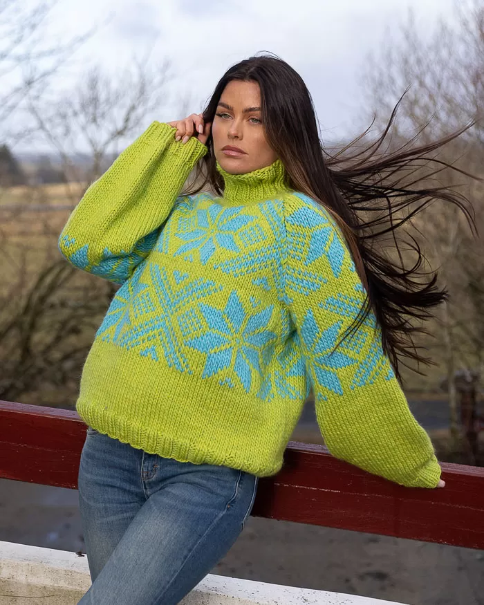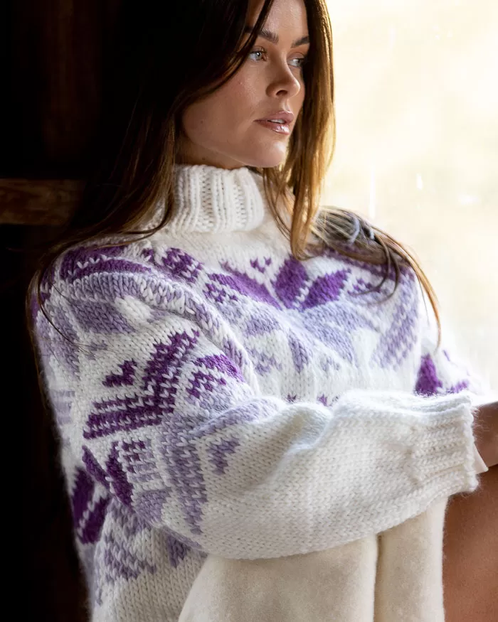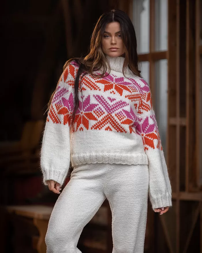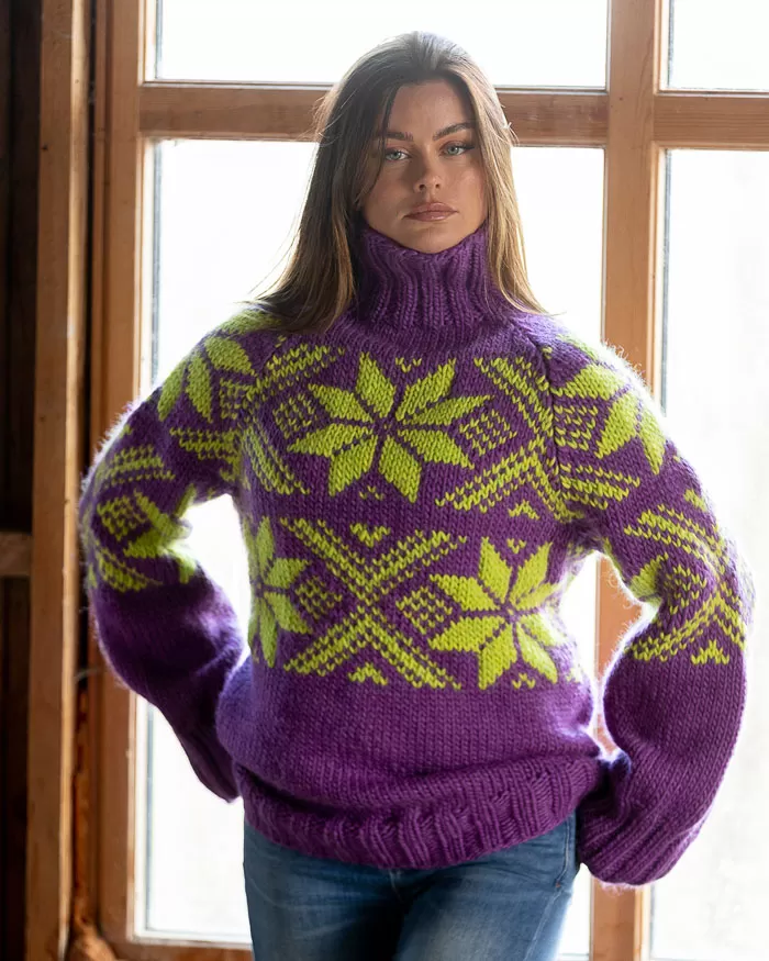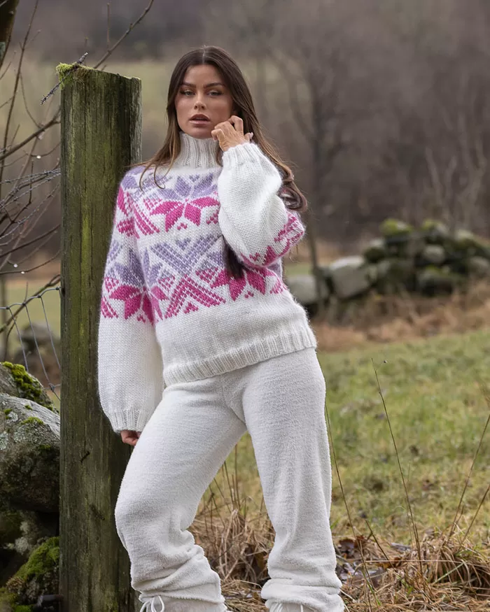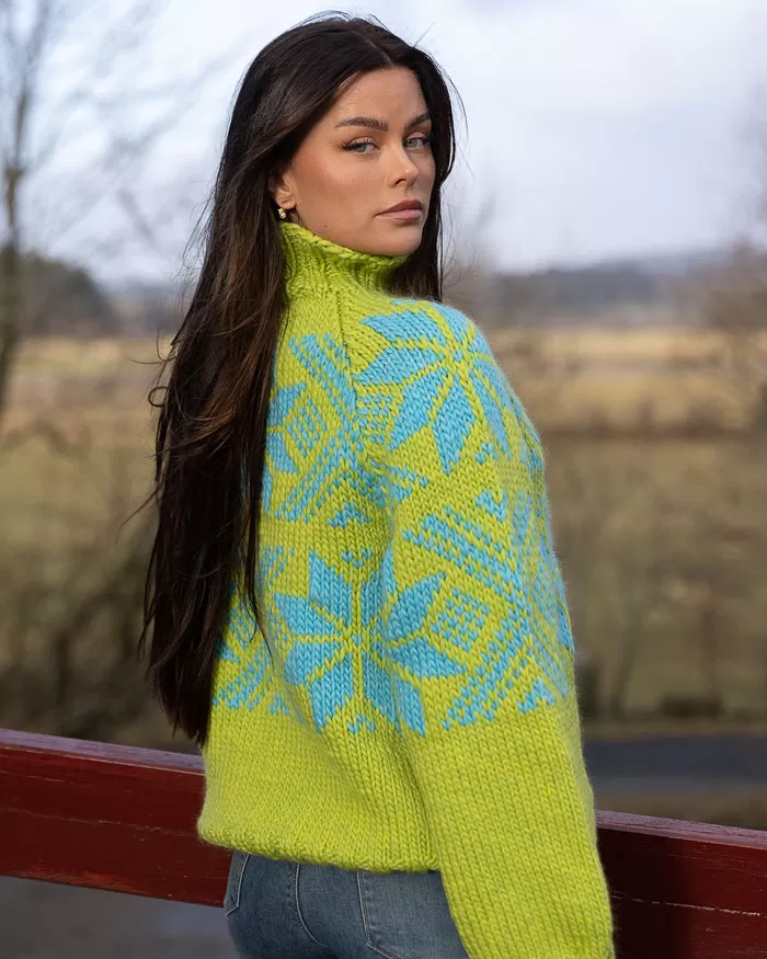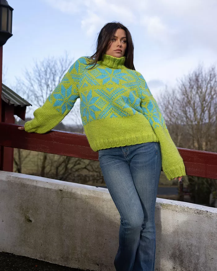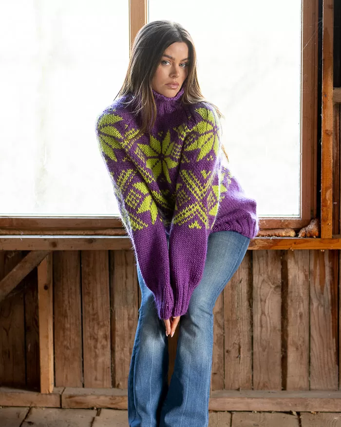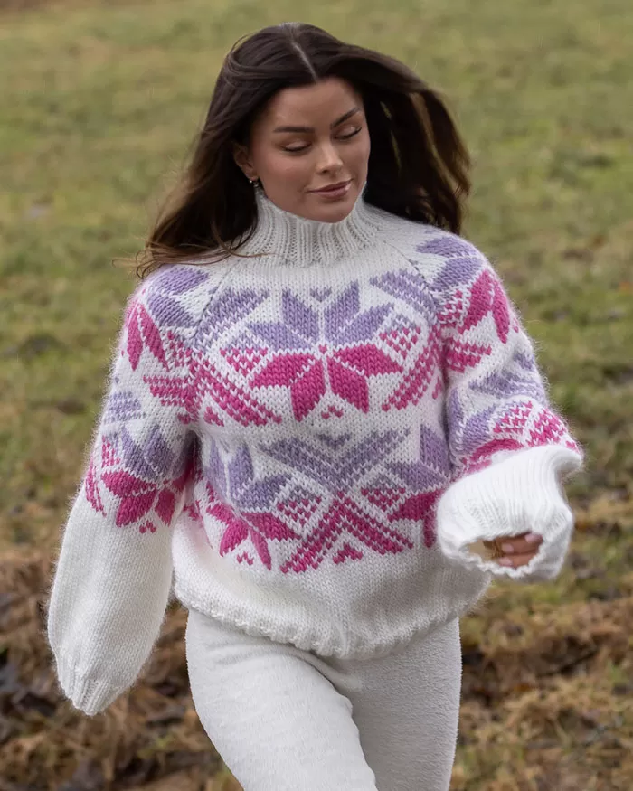 Tämä väljä ja suurin kirjoneulekuvioin neulottu neulepaita tuo mieleen nostalgisia hetkiä, mutta on trendikäs myös nykyhetkessä. Neulepaidan keskiosassa koreilevat tähtikuviot ja muut symmetriset kuvioaiheet voidaan neuloa joko yksi- tai kaksivärisiksi, ja mitä selkeämmin toisistaan erottuvilla väreillä kuvioita neulotaan, sitä näyttävämmin ne hehkuvat pohjavärin keskellä. Neulepaidassa helman mitta on hieman tavallista lyhyempi ja suuret raglanhihat tuovat neuleeseen parempaa istuvuutta. Korkea joustinneulekaulus kruunaa neuleen ulkonäön, ja sen voi halutessaan kääntää kaksin kerroin työn etupuolelle. Valitse siis kaksi tai kolme lempiväriäsi Snorre-langan raikkaasta värikartasta ja neulo tulevaan talveen häikäisevän upea kirjoneulepaita!
