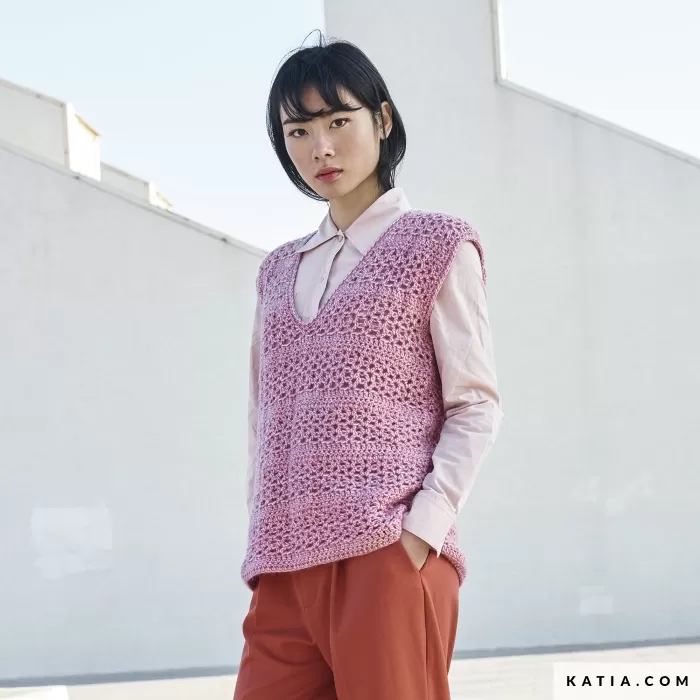 Tässä pehmeässä V-aukkoisessa liivissä vuorottelevat näyttävä virkattu pitsi ja kapeat pylväsraidat. Cotton-Merino-langan erikoisen eläväinen väri saa virkkuupinnan säihkymään, ja se jos mikä sopii täydellisesti yhteen päivä päivältä lämmittävän kevätauringon kanssa. Jos pidät virkkaamisesta, tämä liiviunelma on ehdottomasti sinun!