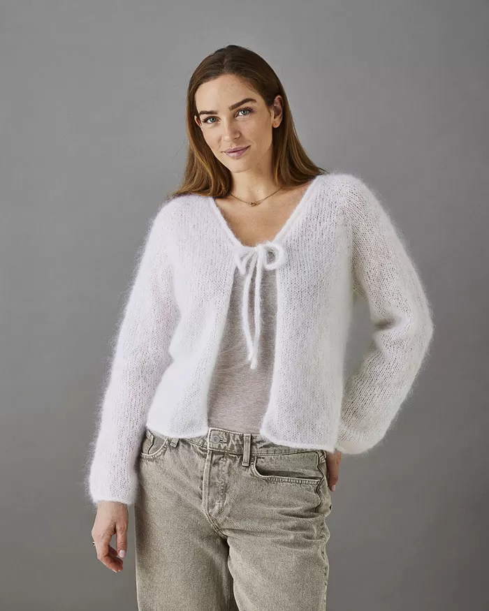 Edestä pyöreillä i-cord-nyöreillä solmittava neuletakki on tämän hetken trendineule! Tässä ylhäältä alas sileänä neuleena neulottavassa neuletakissa on raglanhihat, ja takin kaikissa reunoissa on pyöreät i-cord-reunat. Pörröisestä Bella-langasta neulottu takki on ihastuttavan kevyt yllä ja sen voi helposti yhdistää monenlaisiin asukokonaisuuksiin.