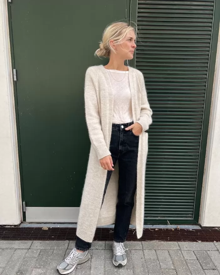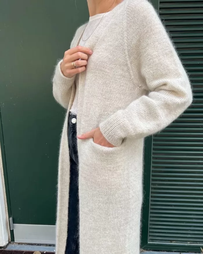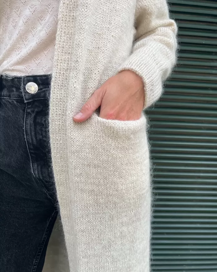 No Frills Cardigan on pitkä neuletakki, joka neulotaan ylhäältä alas raglan-lisäyksillä. Neuletakki neulotaan sileänä neuleena ja pääntien reunus neulotaan joustinneuleella, joka jatkuu alas etureunoja pitkin. Lopuksi taskut neulotaan poimituista silmukoista jälkikäteen neuletakin etukappaleisiin.