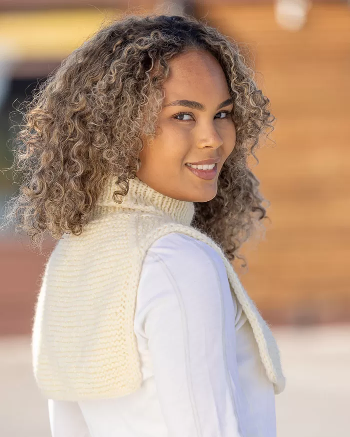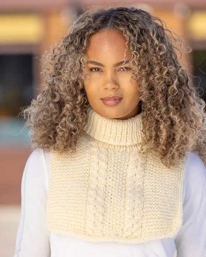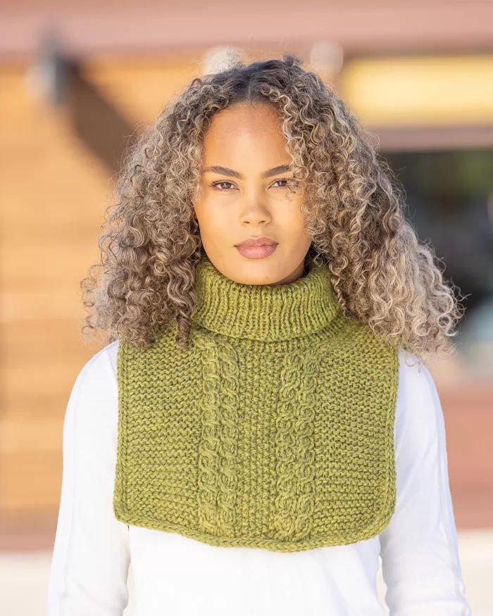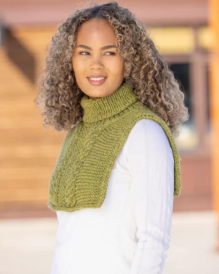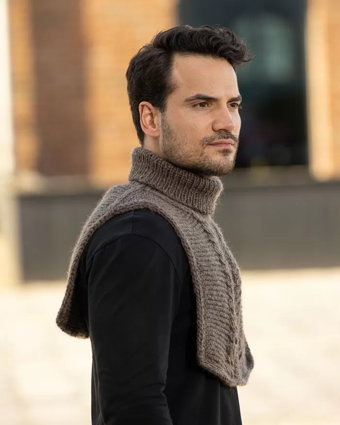 Tuuleeko niskaan, paleleeko selkä, entä tuntuuko kaulaliinan kietaisu kaulaan hankalalta? Jos vastasit johonkin näistä kyllä, on silloin ratkaisu ongelmaan paksu villakauluri! Tämän ylhäältä alas neulottavan kaulurin eurooppalaiset olkapäät istuttavat käytännöllisen asusteen hartioille kuin sopivat palapelin palat, ja korkean kaksin kerroin käännettävän kauluksen ansiosta tuuli ja viima ynnä pakkasen pistävä purevuus eivät pääse kylmettämään kaulan aluetta. Etukappaleen keskellä kulkeva palmikkoa ja pintaneuletta yhdistelevä koristepaneeli on upea yksityiskohta rauhallisen ainaoikeinneuloksen joukossa. Kaulurin viimeistellystä ja pehmeälinjaisesta ilmeestä vastaavat ulkoreunojen sekä viistojen eurooppalaisten olkapäiden pyöreät i-cord-reunat.