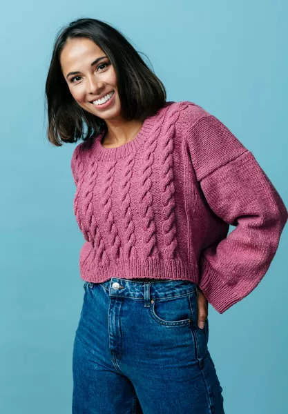 Elvira-palmikkopaita on malliltaan trendikkään väljä, lyhyt ja laatikkomainen. Keskellä edessä ja takana kulkee kuusi muhkeaa palmikkoa, muuten paita on sileää neuletta ja reunukset joustinneuletta. Pääntien joustin on kaksinkertainen, mikä tuo neuleelle viimeistellyn ilmeen ja antaa ryhtiä pääntielle. Ohjeessa on koot XS-4XL ja kierrätysmateriaaleista valmistettua New Life Wool -lankaa tarvitaan 5-10 vyyhtiä.
