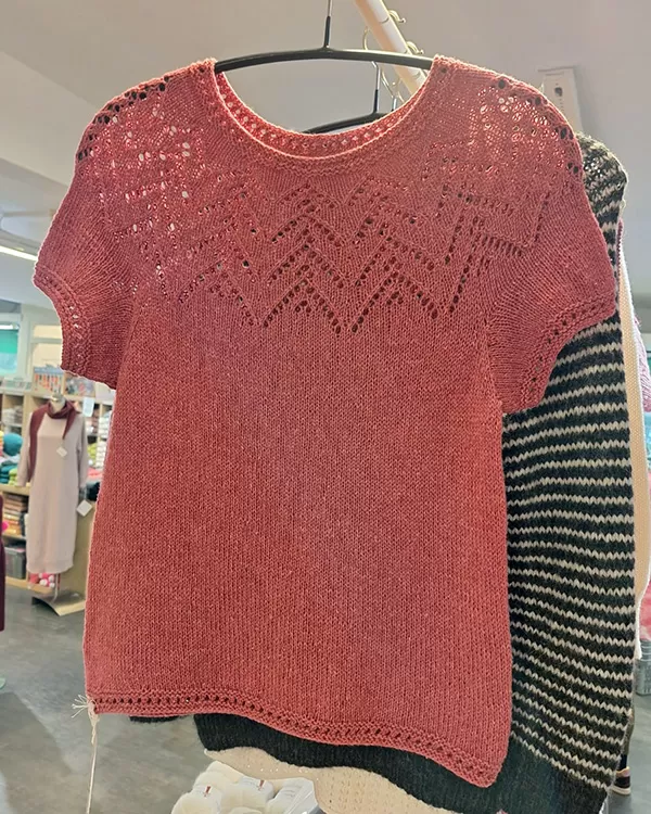 Lyhythihainen neulepaita pitsikaarrokkeella ja tyylikkäillä reikäpitsikoristereunuksilla on nappivalinta hellekesän varustukseen, mutta sopii yhtä hyvin käytettäväksi muinakin hetkinä ympäri vuoden. Luonnonkuituisesta Organic Trio -merinosekoitelangasta neulottu neulevaate on väritykseltään kauniin meleerattu ja eläväpintainen. Istuvuuden parantamiseksi takakappale neulotaan lyhennetyin kerroksin etukappaletta korkeammaksi, kädenteitä suurennetaan tekemällä raglantyylisiä lisäyksiä taka- ja etukappaleiden sivuihin ja olkapäille tehdään lisää liikkumavaraa neulomalla hihojen päällipuolta korkeammaksi lyhennetyin kerroksin. Tämä pitsineulepaita hurmaa ulkonäöllään, ja vaikka paidan malli on vartalon muotoa mukaileva, se ei kuitenkaan ole täysin ihonmyötäinen.