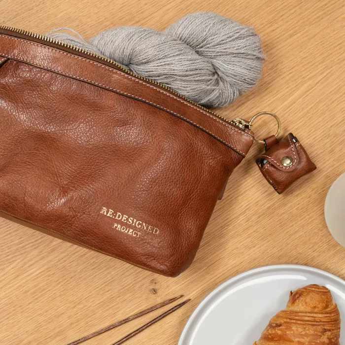 Re:Designed Project 4 on tyylikäs laukku, joka on valmistettu pehmeästä pähkinänruskeasta nahasta ja suunniteltu erityisesti neulojille ja käsitöiden harrastajille projektipussiksi. Käytännölliseen ja kauniiseen pussiin mahtuu pieni neuletyö puikkoineen ja tarvikkeineen, mutta se toimii erinomaisesti myös tavallisena käsilaukkuna.