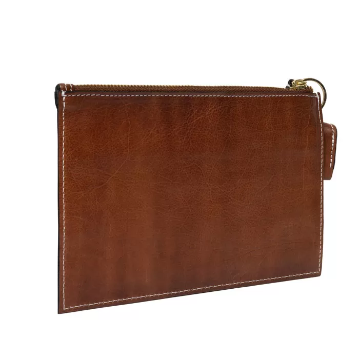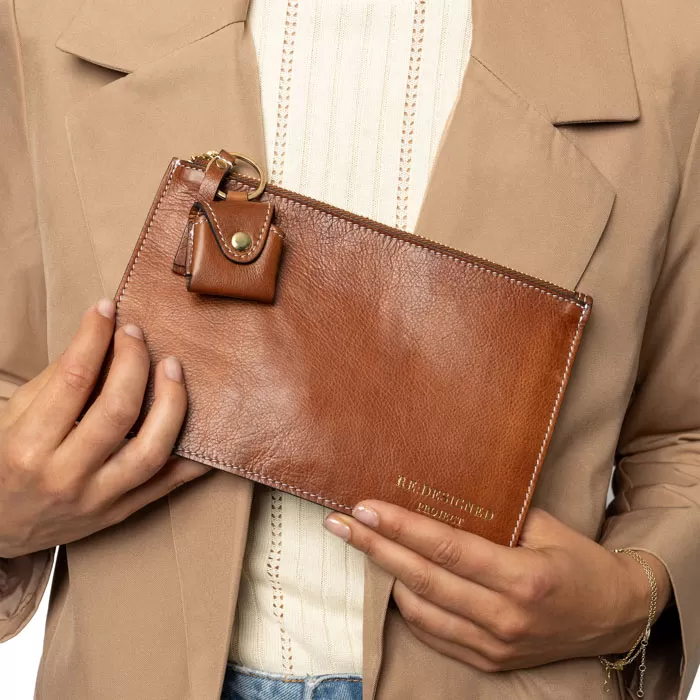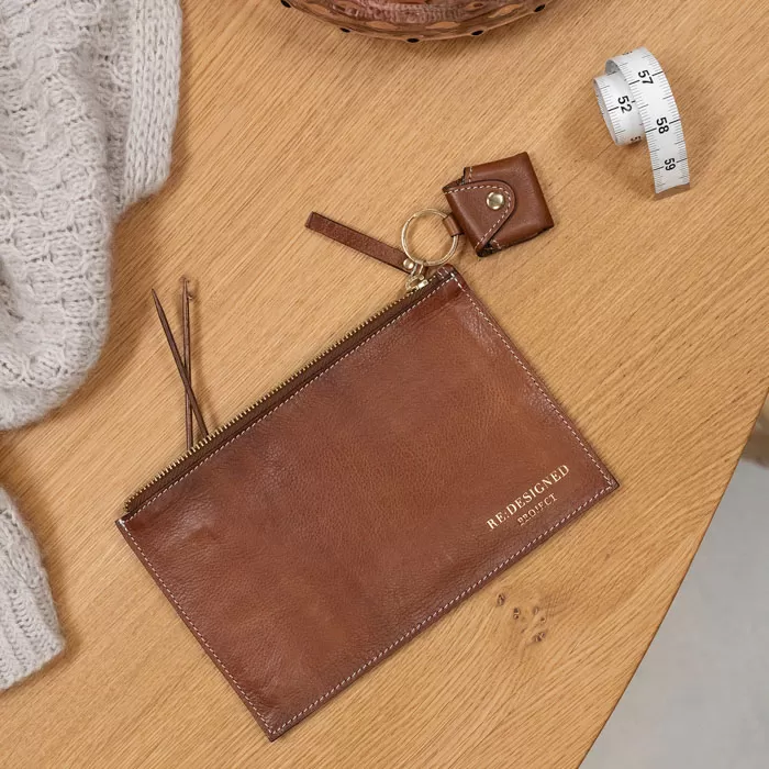 Nahkainen säilytyspussi on klassisen tyylikäs ja kestävä säilytysratkaisu pikkutavaroille. Pieni vetoketjullinen pussi on ulkomitoiltaan noin 22 x 15 cm, joten pussiin mahtuu esimerkiksi 20 cm pitkät sukkapuikot ja pieni lankakerä. Pinta on pähkinänruskeaa pehmeää nahkaa kullanvärisillä yksityiskohdilla. Pussi on vuorattu kankaalla ja sisällä on yksi vetoketjullinen sisätasku. Lisäksi ulkopuolella vetoketjun vetimessä on avainrenkaalla kiinnitetty pieni nepparilla suljettava tasku, johon sopii vaikkapa mittanauha.