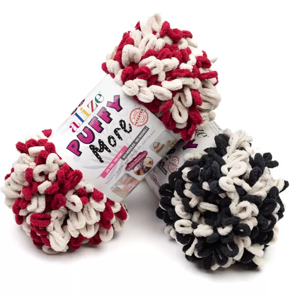 Puffy More on mielenkiintoinen kaksinkertainen versio huippusuositusta Puffy-sormineulontalangasta. Pehmeääkin pehmeämmässä samettilangassa on valmiita lankalenkkejä eli silmukoita, joita pujotellaan sormin toistensa läpi, eikä neulomiseen tarvita lainkaan puikkoja.