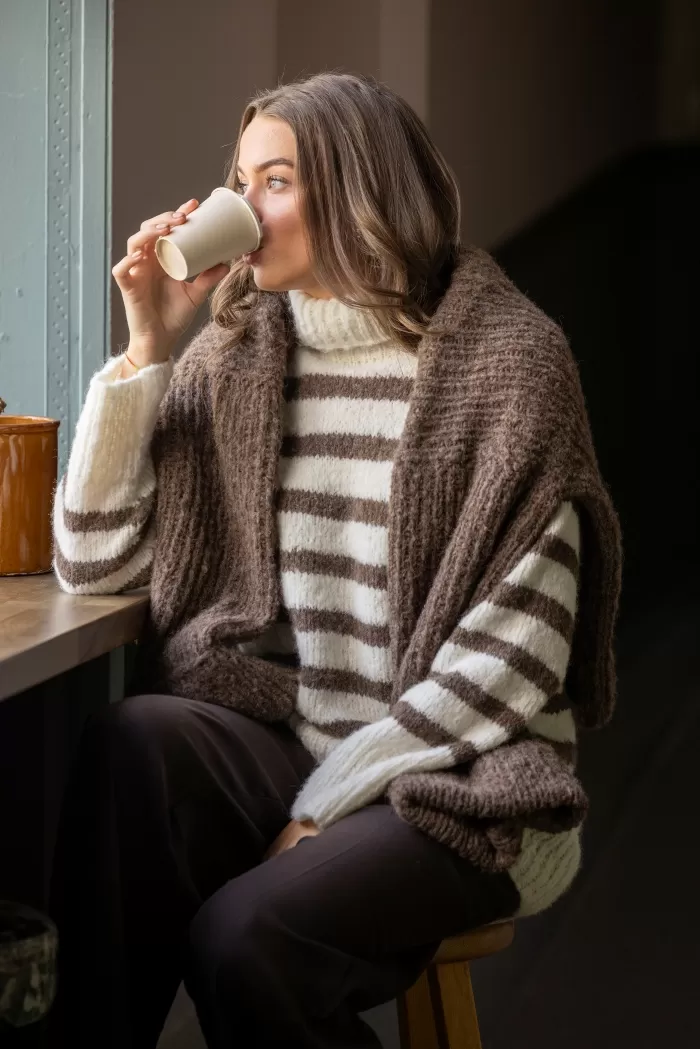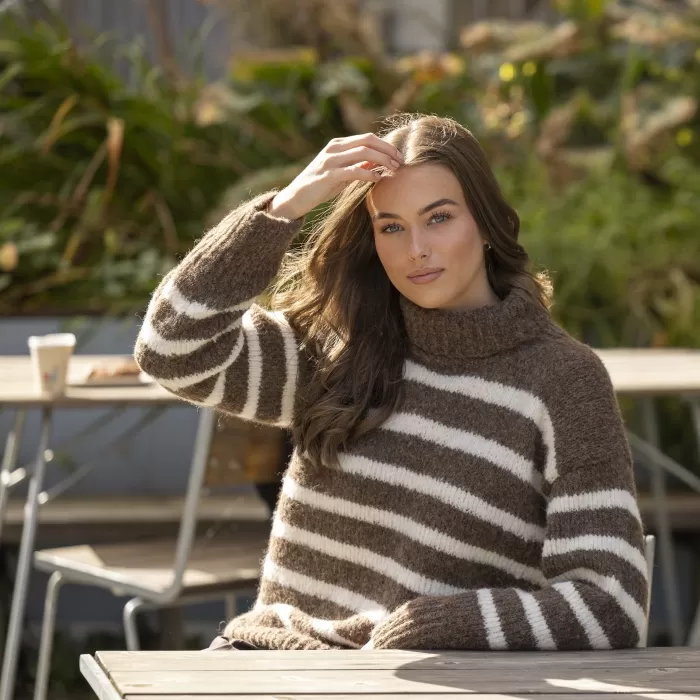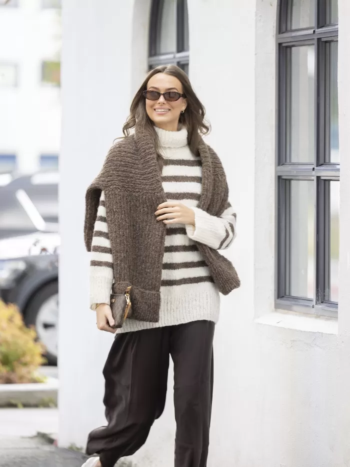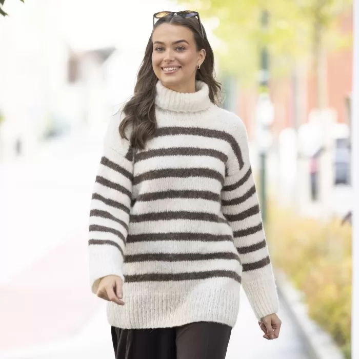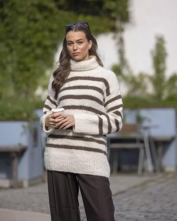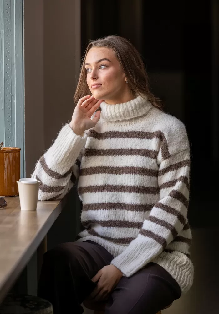 Raitakuosi on ajaton klassikko, joka on aina muodissa! Tässä kaksivärisessä pitkähelmaisessa neulepaidassa neulotaan vuorotellen korkeampia ja matalampia raitoja, jotka yhdistettynä pörheäpintaisen langan kanssa saavat neuleen näyttämään yhtä aikaa sekä seesteiseltä että erittäin tyylikkäältä. Korkea poolokaulus, alas laskeutuva olkalinja ja väljät hihat takaavat ihanan rennon fiiliksen. Muunna neulepaidan ilmettä helposti vaihtamalla pääväri ja raitaväri toisin päin.