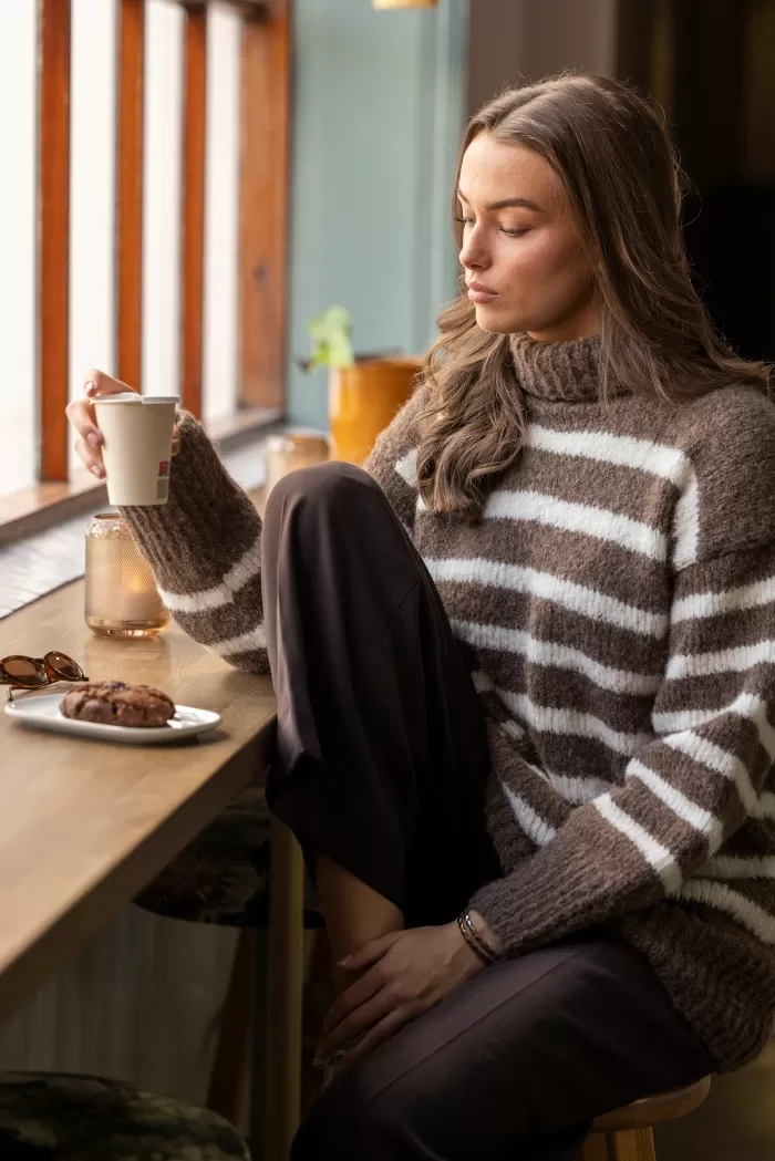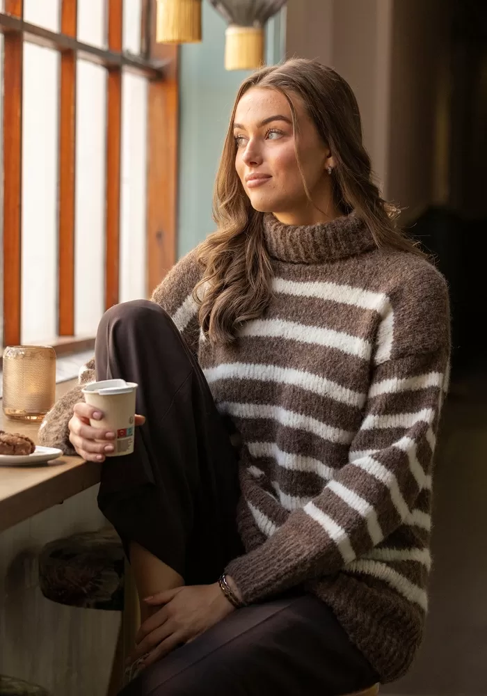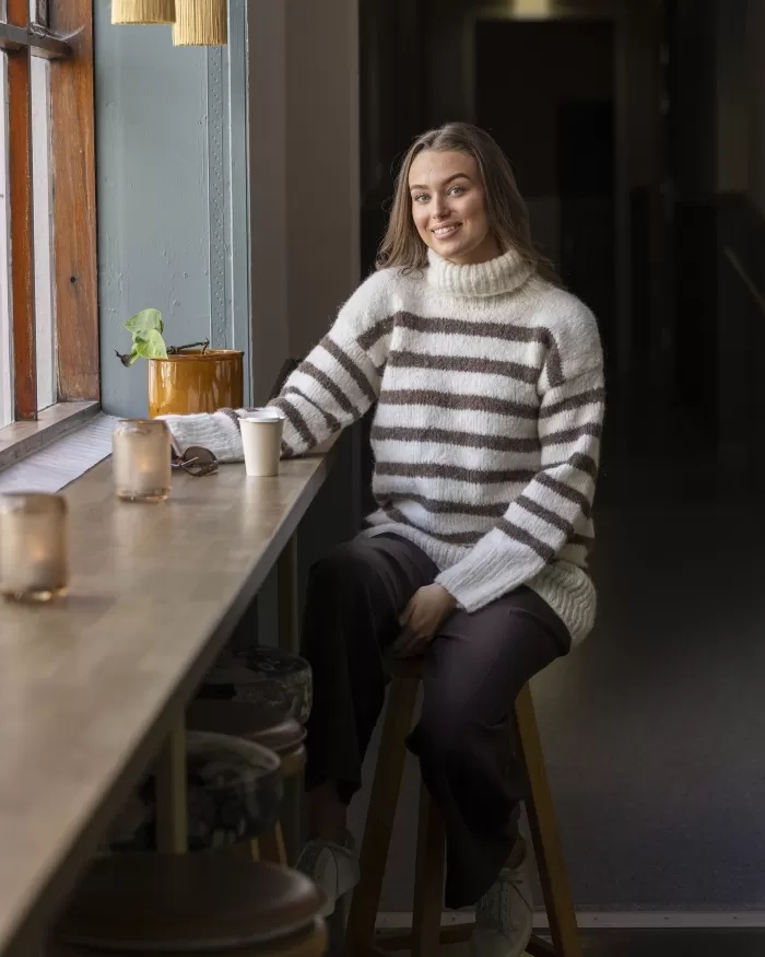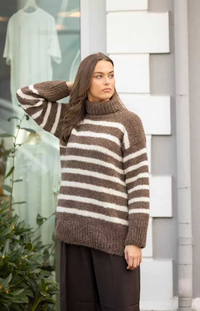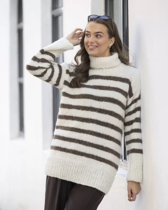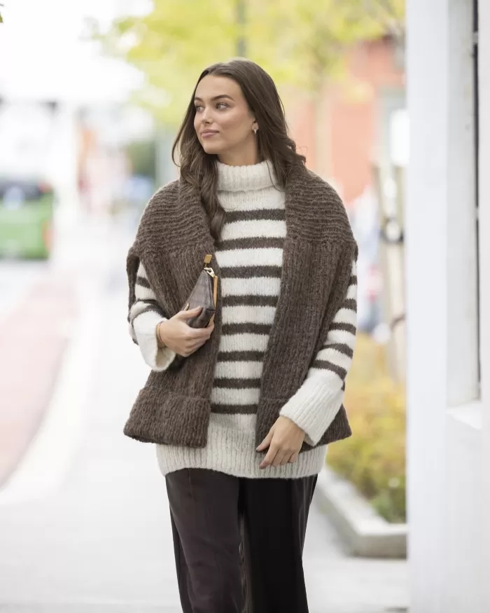 Raitakuosi on ajaton klassikko, joka on aina muodissa! Tässä kaksivärisessä pitkähelmaisessa neulepaidassa neulotaan vuorotellen korkeampia ja matalampia raitoja, jotka yhdistettynä pörheäpintaisen langan kanssa saavat neuleen näyttämään yhtä aikaa sekä seesteiseltä että erittäin tyylikkäältä. Korkea poolokaulus, alas laskeutuva olkalinja ja väljät hihat takaavat ihanan rennon fiiliksen. Muunna neulepaidan ilmettä helposti vaihtamalla pääväri ja raitaväri toisin päin.