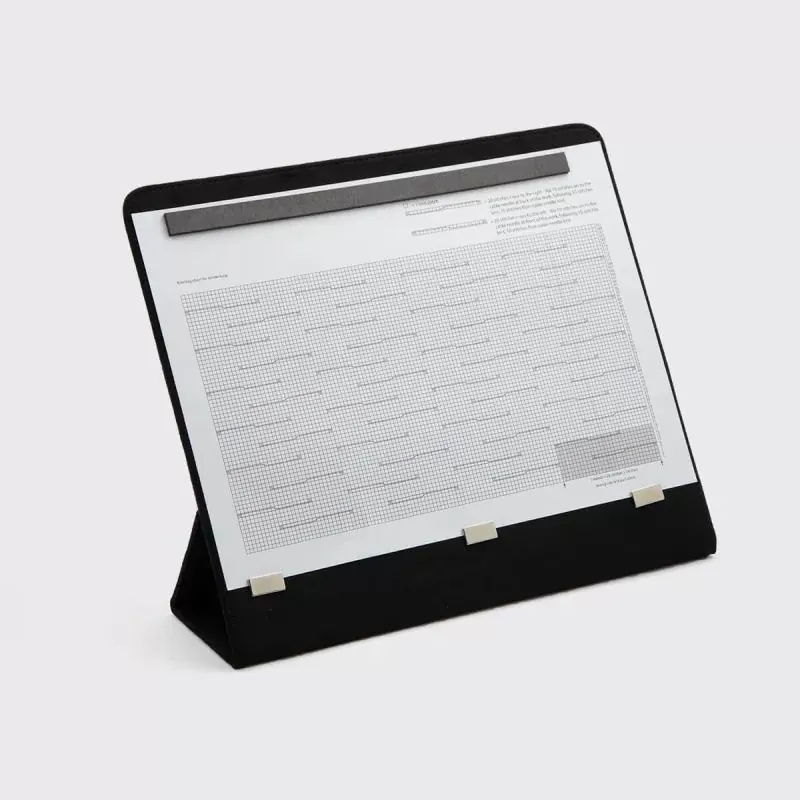 Mitat: aukinaisena: 40 cm x 27 cm, kiinni: 20 cm x 27 cm. Auki taitettu teline on mitoitettu vaakasuoralle A5-paperiarkille.