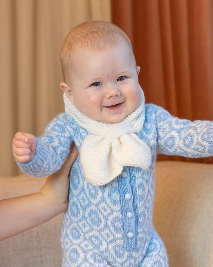 Tämä söötti vauvan asustesetti sisältää huivin ja lapaset. Huivin erikoisuus piilee sen kiinnityksessä:koska huivin molemmissa päissä on aukot, huivin voi kiinnittää eri päin joko oikea pää vasemman läpi tai päinvastoin. Tasoneuleena neulottava huivi neulotaan aukkojen osuuksia lukuun ottamatta ainaoikeinneuleena. Aukon neulomista varten silmukat jaetaan hetkellisesti puoliksi eli niin sanotusti "etukappaleeksi" ja "takakappaleeksi" ja molemmat kappaleet neulotaan eriksen joustinneuleena ohjeen mukaiseen mittaan. Joustinneule auttaa pitämään huivin kiinnityksen paremmin paikoillaan. Huivin kanssa yhteen sopivat helpot pyörönä neulottavat lapaset. Lapaset valmistuvat joutuisasti, sillä niihin ei tehdä peukaloaukkoa. Lapasissa on joustinreunus ja kärjessä nauhakavennukset.