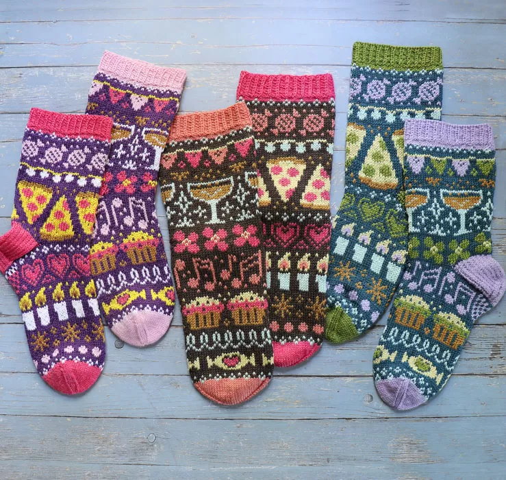 Viikonloppu-eriparisukkien parissa pääset haastamaan kirjoneuletaitojasi toinen toistaan upeampien kuvioiden kanssa. Mukana on ripaus kolmella värillä neulottavia kerroksia sekä silmukointia, jolla saadaan kuvioiden yksityiskohdat viimeisteltyä. Sukkamallin on suunnitellut Heini Perälä / Heinikki Design, joka tunnetaan kauniista ja oivaltavia yksityiskohtia pursuavista kirjoneuleistaan.