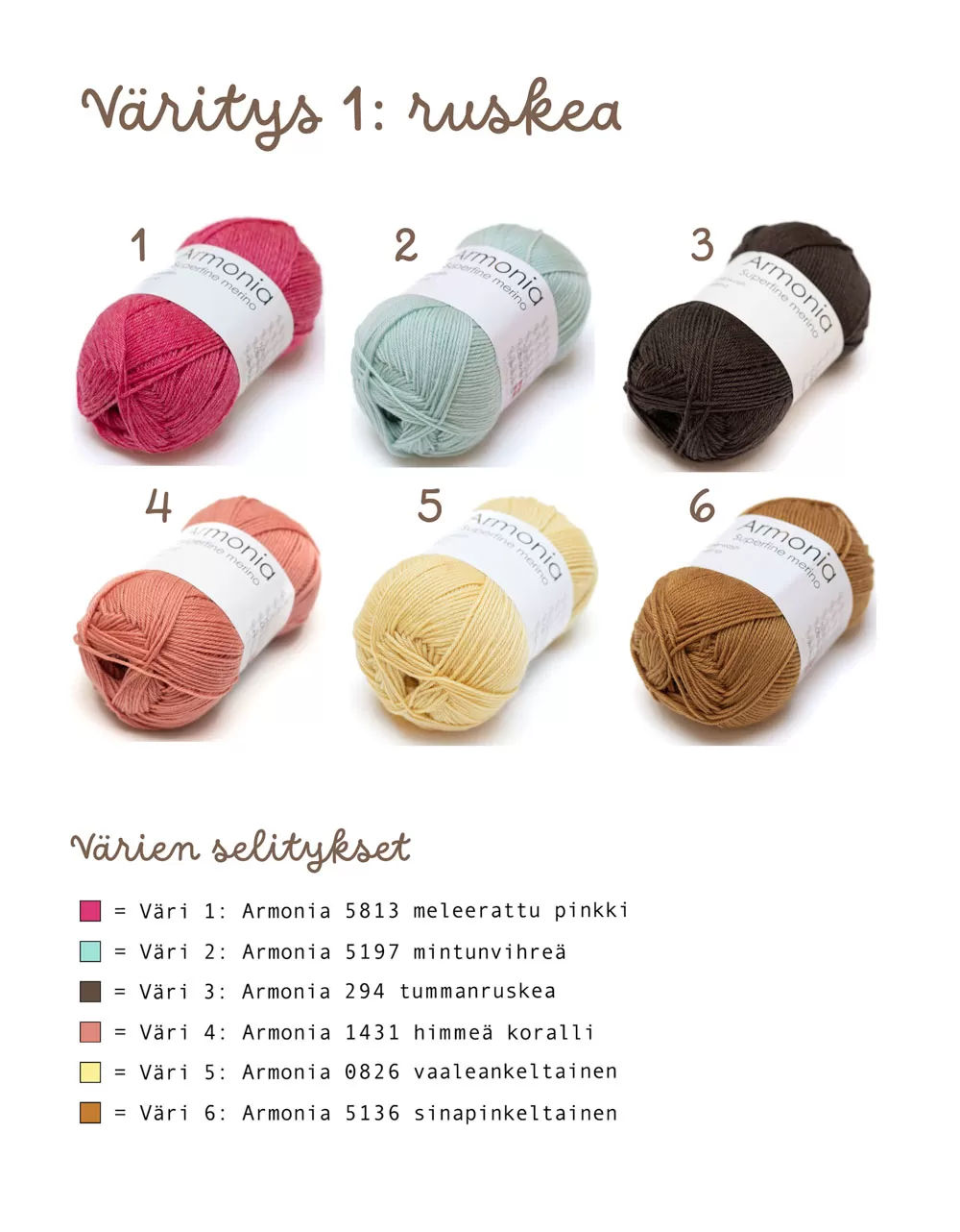 Viikonloppu-sukkien tekemispaketti sisältää yhteensä 6 kerää eli 300 g Armonia-lankaa. Armonia on ohut ja huippupehmeä merinovillasukkalanka, jossa on vahvikkeena 25 % nylonia. Yhdessä kerässä on 50 g / 200 m. Lankojen lisäksi tarvitset 2,5 mm sukkapuikot (tai käsialan mukaan).