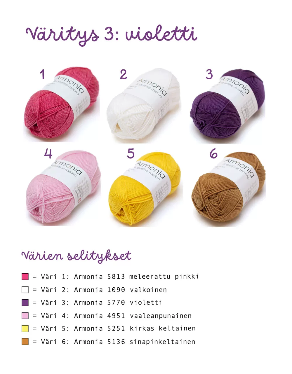 Heini on suunnitellut sukkiin kolme erilaista väritystä: ruskeapohjainen, petroolipohjainen ja violettipohjainen. Ohjeen kaaviot on piirretty ruskean värityksen mukaan. Jos haluat suunnitella sukkiin oman värityksesi, ohje on ostettavissa myös erikseen paperitulosteena.
