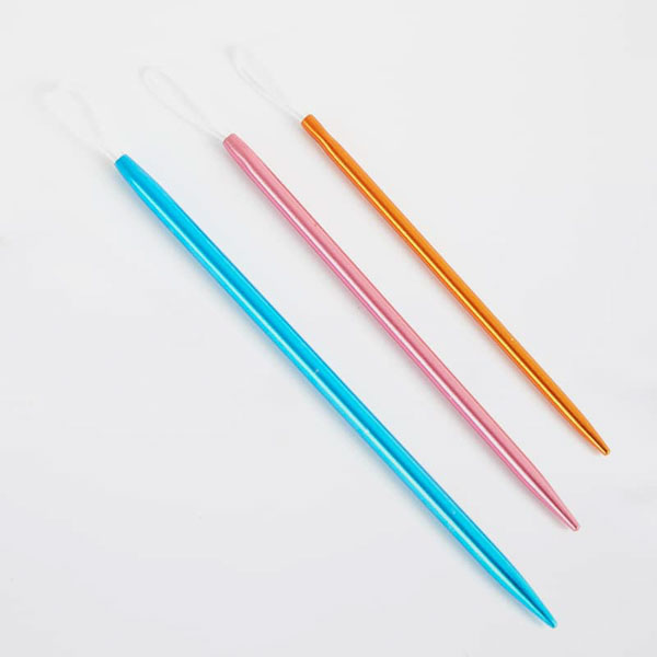 KnitPron värikkäissa metallisissa villaneuloissa on siimalenkki, johon on helpppo pujottaa paksumpikin lanka. Paketissa on kolme eri kokoista ja eri väristä villaneulaa.