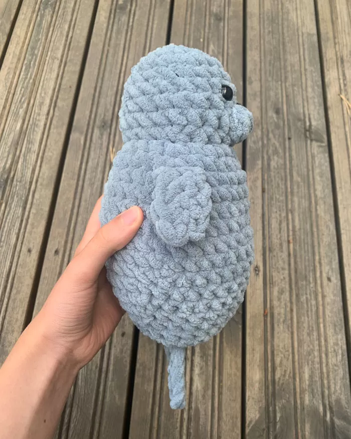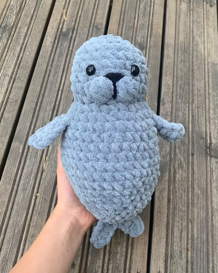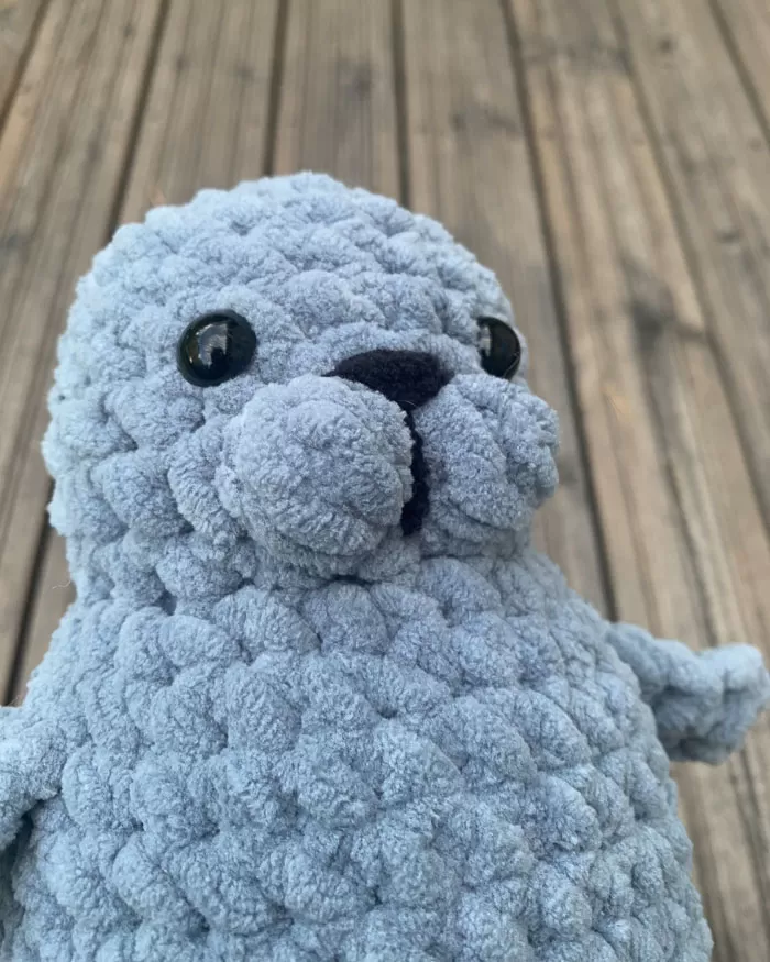 Tämä suloinen Velluto-samettilangasta virkattu hyljepehmolelu sopii lasten leikkihetkiin ja on myös todella pehmoinen unilelu. Pehmolelussa on turvasilmät, jotka kiinnitetään ennen työn sulkemista ja täyttämistä, jotta silmien muoviset takaosat saadaan hyvin paikoilleen. Eläinpehmo virkataan ylhäältä alas spiraalina, ja erikseen virkatut pyrstö ja evät kiinnitetään kehoon ompelemalla. Nenä kirjotaan kasvoihin työn lopuksi ja kuono virkataan kahdella nyppysilmukalla. Virkkuupinnan on hyvä olla tiivistä, jotta täytevanu pysyy pehmon sisällä.